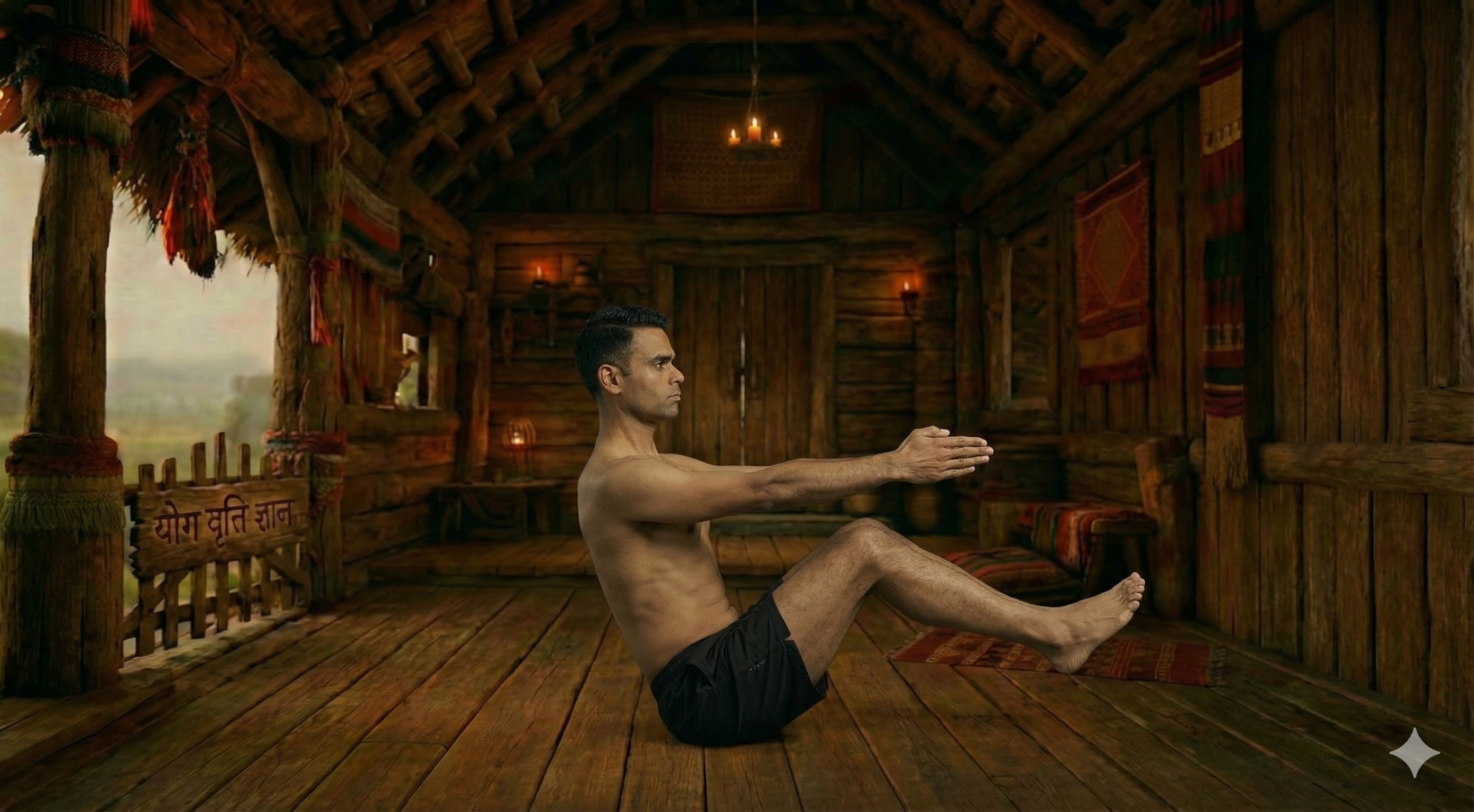 4. शरीर को V-shape में बनाएं, नाभि की ओर देखें। (Create a V-shape with your body, looking towards your navel.)